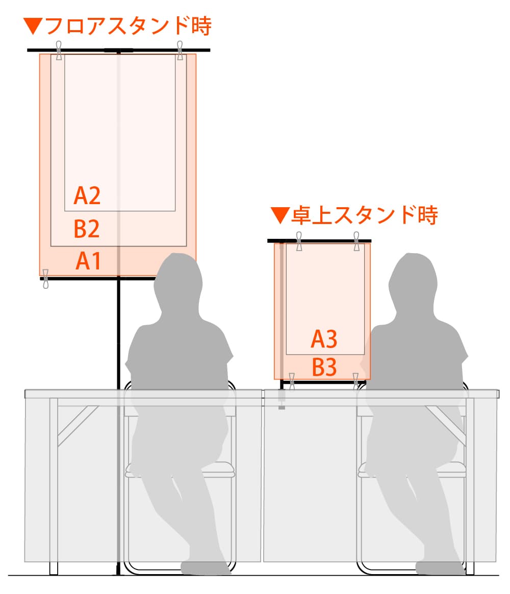 最小の制限は特にありませんが、あまり小さすぎると横棒が余り過ぎるので、フロアスタンド時でA2縦サイズ程度~、卓上スタンド時でA3縦サイズ程度~がおすすめです。